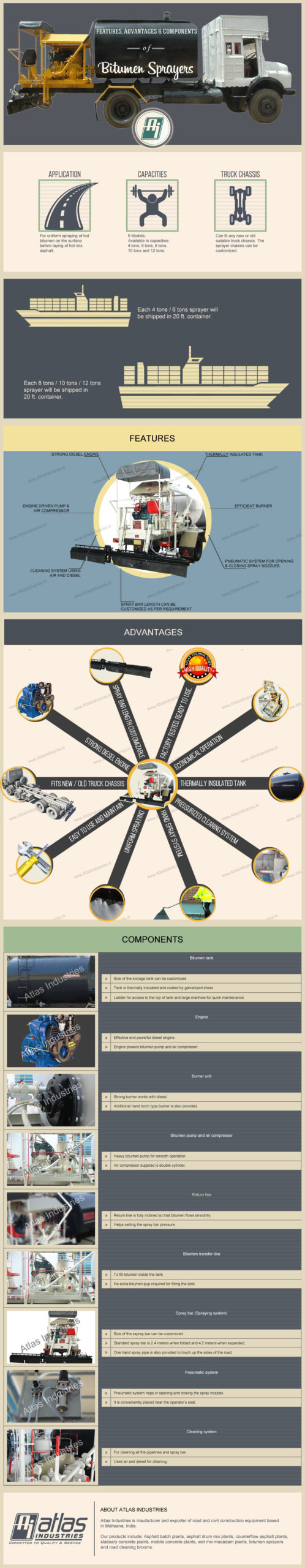 Atlas Technologies Pvt. Ltd. is a leading exporter of a variety of civil and road construction equipment. We design and manufacture bitumen sprayers that come in diverse configurations. Our line of bitumen sprayers includes capacities ranging from 12 tons, 10 tons, 8 tons, 6 tons, and 4 tons. Atlas Technologies regularly supplies and exports mini and small bitumen sprayers in numerous parts of the world.